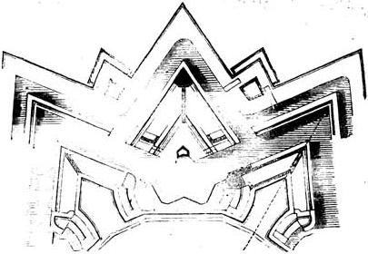 vorliegenden Werke dem direkten Feuer des Angreifers entzogen ist; die Bastionen voll und geräumig mit langen Flanken und kurzen Facen (s. beistehende