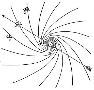 Wirbelsturms die gefährliche ist; denn ein Schiff in b (s. Abbildung) muß die Bahn des Centrums