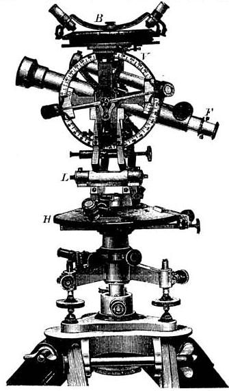 Stuttgart gefertigten Repetitionstheodoliten ist H der Horizontalkreis, V der Vertikalkreis, F Fernrohr, L Libelle, B eine Orientierungsbussole mit