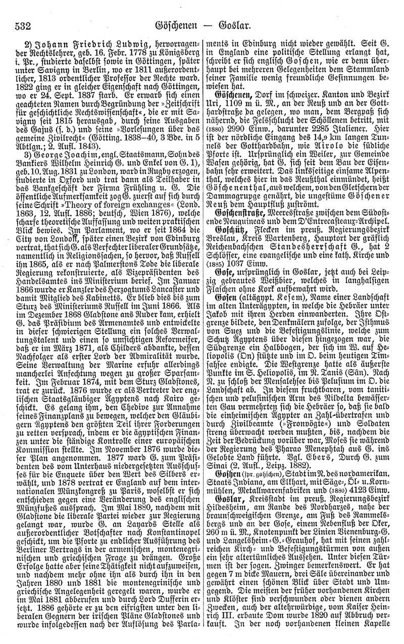 3) George Joachim, engl. Staatsmann, Sohn des Bankiers Wilhelm Heinrich G. und Enkel von G. 1), geb. 10. Aug. 1831 zu London, ward in Rugby erzogen, studierte in Oxford und trat dann als Teilhaber in das Bankgeschäft der Firma Frühling u. G. Die öffentliche Aufmerksamkeit zog G. zuerst auf sich durch seine Schrift "Theory of foreign exchanges" (Lond. 1863, 12. Aufl. 1886; deutsch, Wien 1876), welche scharfe theoretische Auffassung und weiten praktischen Blick bewies. Im Parlament, wo er seit 1864 die City von London; später einen Bezirk von Edinburg vertrat, that sich G. als Verfechter liberaler Grundsätze, namentlich in Religionssachen, so hervor, daß Russell ihn 1865, als er nach Palmerstons Tode, die liberale Regierung rekonstruierte, als Vizepräsidenten des Handelsaktes ins Ministerium berief. Im Januar 1866 wurde er Kanzler des Herzogtums Lancaster und damit Mitglied des Kabinetts. Er blieb dies bis zum Sturz des Ministeriums Russell im Juni 1866. Als im Dezember 1868 Gladstone ans Ruder kam, erhielt G. das Präsidium des Armenamtes und entwickelte in dieser schwierigen Stellung ein solches Verwaltungstalent und einen so umsichtigen Reformeifer, daß er im März 1871, als Childers abdankte, dessen Nachfolger als erster Lord der Admiralität wurde. Seine Verwaltung der Marine erfuhr allerdings mancherlei Anfechtung wegen zu großer Sparsamkeit. Im Februar 1874, mit dem Sturz Gladstones, trat er zurück. 1876 wurde er als Vertreter der englischen Staatsgläubiger Ägyptens nach Kairo geschickt. Es gelang ihm, den Chedive zur Annahme seines Finanzplans zu bewegen, welcher den Gläubigern Ägyptens den größten Teil ihrer Forderungen zu retten versprach, indem er die ägyptischen Finanzen unter die ständige Kontrolle einer europäischen Kommission stellte. Im November 1876 wurde dieser Plan angenommen. 1877 ward G. zum Präsidenten des vom Unterhaus niedergesetzten Ausschusses für die Enquete über den Wert des Silbers erwählt, und 1878 vertrat er England auf dem internationalen Münzkongreß zu Paris, woselbst er sich entschieden gegen eine Veränderung des englischen Münzfußes aussprach. Im Mai 1880, nachdem mit Gladstone die liberale Partei wieder zur Regierung gelangt war, wurde G. an Layards Stelle als außerordentlicher Botschafter nach Konstantinopel geschickt, um die Pforte zu endlicher Ausführung des Berliner Vertrags in der armenischen, montenegrinischen und griechischen Frage zu drängen. Große Erfolge hatte aber seine Thätigkeit nicht aufzuweisen, und nachdem mehr ohne ihn als durch ihn in den Jahren 1880 und 1881 die montenegrinische und griechische Angelegenheit geregelt waren, wurde er im Mai 1881 abberufen und durch Lord Dufferin ersetzt. 1886 gehörte er zu den eifrigsten unter den liberalen Gegnern der irischen Pläne Gladstones und wurde infolgedessen nach der Auflösung des Parlaments in Edinburg nicht wieder gewählt. Seit G. in England eine politische Stellung erlangt hat, schreibt er sich englisch Goschen, wie er denn überhaupt bei mehreren Gelegenheiten dem Stammland seiner Familie wenig freundliche Gesinnungen bewiesen hat.