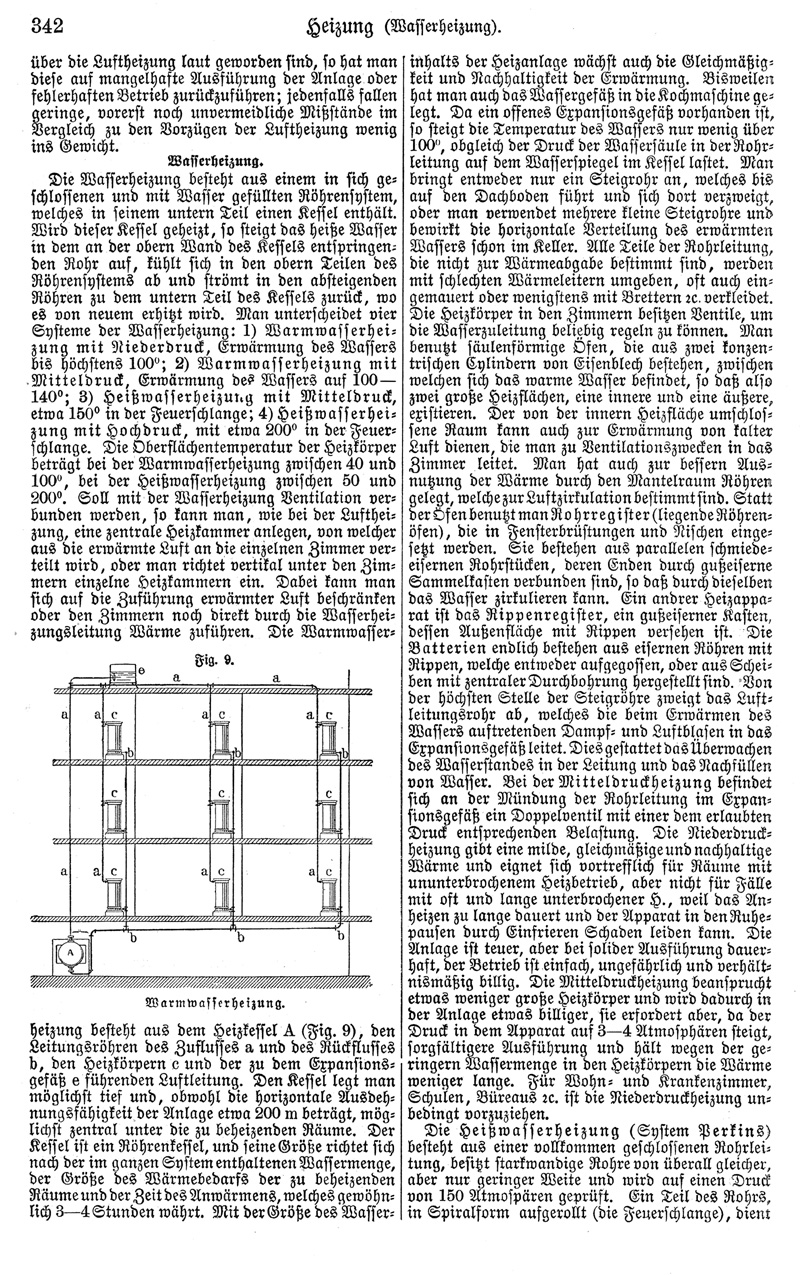 Die Wasserheizung besteht aus einem in sich geschlossenen und mit Wasser gefüllten Röhrensystem, welches in seinem untern Teil einen Kessel enthält. Wird dieser Kessel geheizt, so steigt das heiße Wasser in dem an der obern Wand des Kessels entspringenden Rohr auf, kühlt sich in den obern Teilen des Röhrensystems ab und strömt in den absteigenden Röhren zu dem untern Teil des Kessels zurück, wo es von neuem erhitzt wird. Man unterscheidet vier Systeme der Wasserheizung: 1) Warmwasserheizung mit Niederdruck, Erwärmung des Wassers bis höchstens 100°; 2) Warmwasserheizung mit Mitteldruck, Erwärmung des Wassers auf 100-140°; 3) Heißwasserheizung mit Mitteldruck, etwa 150° in der Feuerschlange; 4) Heißwasserheizung mit Hochdruck, mit etwa 200° in der Feuerschlange. Die Oberflächentemperatur der Heizkörper beträgt bei der Warmwasserheizung zwischen 40 und 100°, bei der Heißwasserheizung zwischen 50 und 200°. Soll mit der Wasserheizung Ventilation verbunden werden, so kann man, wie bei der Luftheizung, eine zentrale Heizkammer anlegen, von welcher aus die erwärmte Luft an die einzelnen Zimmer verteilt wird, oder man richtet vertikal unter den Zimmern einzelne Heizkammern ein. Dabei kann man sich auf die Zuführung erwärmter Luft beschränken oder den Zimmern noch direkt durch die Wasserheizungsleitung Wärme zuführen. Die Warmwasserheizung besteht aus dem Heizkessel A (Fig. 9), den Leitungsröhren des Zuflusses a und des Rückflusses b, den Heizkörpern c und der zu dem Expansionsgefäß e führenden Luftleitung. Den Kessel legt man möglichst tief und, obwohl die horizontale Ausdehnungsfähigkeit der Anlage etwa 200 m beträgt, möglichst zentral unter die zu beheizenden Räume. Der Kessel ist ein Röhrenkessel, und seine Größe richtet sich nach der im ganzen System enthaltenen Wassermenge, der Größe des Wärmebedarfs der zu beheizenden Räume und der Zeit des Anwärmens, welches gewöhnlich 3-4 Stunden währt. Mit der Größe des Wasserinhalts der Heizanlage wächst auch die Gleichmäßigkeit und Nachhaltigkeit der Erwärmung. Bisweilen hat man auch das Wassergefäß in die Kochmaschine gelegt. Da ein offenes Expansionsgefäß vorhanden ist, so steigt die Temperatur des Wassers nur wenig über 100°, obgleich der Druck der Wassersäule in der Rohrleitung auf dem Wasserspiegel im Kessel lastet. Man bringt entweder nur ein Steigrohr an, welches bis auf den Dachboden führt und sich dort verzweigt, oder man verwendet mehrere kleine Steigrohre und bewirkt die horizontale Verteilung des erwärmten Wassers schon im Keller. Alle Teile der Rohrleitung, die nicht zur Wärmeabgabe bestimmt sind, werden mit schlechten Wärmeleitern umgeben, oft auch eingemauert oder wenigstens mit Brettern etc. verkleidet. Die Heizkörper in den Zimmern besitzen Ventile, um die Wasserzuleitung beliebig regeln zu können. Man benutzt säulenförmige Öfen, die aus zwei konzentrischen Cylindern von Eisenblech bestehen, zwischen welchen sich das warme Wasser befindet, so daß also zwei große Heizflächen, eine innere und eine äußere, existieren. Der von der innern Heizfläche umschlossene Raum kann auch zur Erwärmung von kalter Luft dienen, die man zu Ventilationszwecken in das Zimmer leitet. Man hat auch zur bessern Ausnutzung der Wärme durch den Mantelraum Röhren gelegt, welche zur Luftzirkulation bestimmt sind. Statt der Öfen benutzt man Rohrregister (liegende Röhrenöfen), die in Fensterbrüstungen und Nischen eingesetzt werden. Sie bestehen aus parallelen schmiedeeisernen Rohrstücken, deren Enden durch gußeiserne Sammelkasten verbunden sind, so daß durch dieselben das Wasser zirkulieren kann. Ein andrer Heizapparat ist das Rippenregister, ein gußeiserner Kasten, dessen Außenfläche mit Rippen versehen ist. Die Batterien endlich bestehen aus eisernen Röhren mit Rippen, welche entweder aufgegossen, oder aus Scheiben mit zentraler Durchbohrung hergestellt sind. Von der höchsten Stelle der Steigröhre zweigt das Luftleitungsrohr ab, welches die beim Erwärmen des Wassers auftretenden Dampf- und Luftblasen in das Expansionsgefäß leitet. Dies gestattet das Überwachen des Wasserstandes in der Leitung und das Nachfüllen von Wasser. Bei der Mitteldruckheizung befindet sich an der Mündung der Rohrleitung im Expansionsgefäß ein Doppelventil mit einer dem erlaubten Druck entsprechenden Belastung. Die Niederdruckheizung gibt eine milde, gleichmäßige und nachhaltige Wärme und eignet sich vortrefflich für Räume mit ununterbrochenem Heizbetrieb, aber nicht für Fälle mit oft und lange unterbrochener H., weil das Anheizen zu lange dauert und der Apparat in den Ruhepausen durch Einfrieren Schaden leiden kann. Die Anlage ist teuer, aber bei solider Ausführung dauerhaft, der Betrieb ist einfach, ungefährlich und verhältnismäßig billig. Die Mitteldruckheizung beansprucht etwas weniger große Heizkörper und wird dadurch in der Anlage etwas billiger, sie erfordert aber, da der Druck in dem Apparat auf 3-4 Atmosphären steigt, sorgfältigere Ausführung und hält wegen der geringern Wassermenge in den Heizkörpern die Wärme weniger lange. Für Wohn- und Krankenzimmer, Schulen, Bureaus etc. ist die Niederdruckheizung unbedingt vorzuziehen.