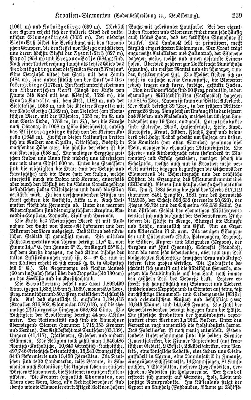 Von der Bodenfläche sind 90 Proz. produktiv, in den ehemaligen Militärdistrikten (Karstgebiet) dagegen nur 81½ Proz. Davon ist kaum ein Drittel Ackerland. Der Wald beträgt 39 Proz., in der frühern Militärgrenze 28 Proz. Von gleichem Umfang ist in der letztern das Wiesen- und Weideland, welches im übrigen Landesgebiet nur 19 Proz. ausmacht. Hauptprodukte sind: Getreide, Mais, Hülsenfrüchte, Hirse, Raps, Kartoffeln, Kraut, Rüben, Flachs, Hanf und besonders viel Holz; Tabak gedeiht um Požega am besten. Die Komitate (vor allen Sirmien) gewinnen viel Wein, weniger die ehemaligen Militärdistrikte. Die Pferde- und Rindviehzucht wird (besonders in Slawonien) mit Erfolg getrieben, weniger jedoch die Schafzucht, welche auch nur in Kroatien mehr veredelt auftritt; dagegen begünstigen die Eichenwälder Slawoniens die Schweinezucht und der reichliche Obstbau die Erzeugung des Pflaumenbranntweins (Slibowitz). Bienen sind häufig, ebenso Geflügel aller Art. Im J. 1884 betrug die Zahl der Pferde 217,112 (darunter 8461 Hengste), 1881 jene des Hornviehs 712,805, der Schafe 588,638 (veredelte 20,623), der Ziegen 99,724 und der Schweine 468,053 Stück. In dem östlichen Gebiet der ehemaligen Militärgrenze rentiert sich auch die Zucht der Seidenwürmer. Fische liefern die Flüsse in Menge, Blutegel die Sümpfe und Teiche, namentlich um Essek. Nur an Erzen und Mineralien ist K. arm. Die wenigen Eisengruben und Hüttenwerke (Rude, Petrovagora, Trgovo), die Silber-, Kupfer- und Bleigruben (Trgovo), der Bergbau auf Zink (Ivanetz), Schwefel (Radoboj), dann die zwar sehr bedeutenden, aber nur zum Teil bloßgelegten Kohlenflöze (zwischen Drau und Kulpa) liefern keine großen Erträge. Die Industrie beschränkt sich zumeist auf die städtischen Gewerbe, wogegen die Hausindustrie auf dem Land noch immer den größern Teil des Bedarfs deckt. Letztere erstreckt sich hauptsächlich auf Spinnerei und Weberei (insbesondere Teppiche und in Sirmien auf feine, fast durchsichtige Baumwoll- und Seidengewebe [Misir] nach orientalischem Muster) und beschäftigt (1883) 16,343 Männer und 144,593 Frauen. Die Zahl der Gewerbtreibenden beträgt dagegen kaum die Hälfte. Die jährliche Produktion der Hausindustrie repräsentiert einen Wert von 1,2 Mill. Gulden. Unter den Gewerben ragt namentlich die Holzindustrie hervor. Das Fabrikwesen ist noch wenig entwickelt. Bedeutendere Unternehmungen sind: die beiden Sirmier Zementfabriken, die Fiumer Papierfabrik (auf kroatischem Gebiet), 2 Sessel-, 2 Möbelfabriken, eine Parkett-, eine königliche Tabaks-, eine Leder- und Steingutfabrik in Agram, eine Tanninfabrik in Zupanje, eine größere Schiffswerfte, 14 Dampfsägen, 81 Kunstmühlen, 7 Glashütten, mehrere Ziegelfabriken, verschiedene Fabriken für Holzwaren etc. Der Handel erstreckt sich zumeist auf Getreide, Holz, Wein und sonstige Naturprodukte. Im Küstenland steigt der Export an Nutzholz (Faßdauben, Bäume zu Schiffs-^[folgende Seite]