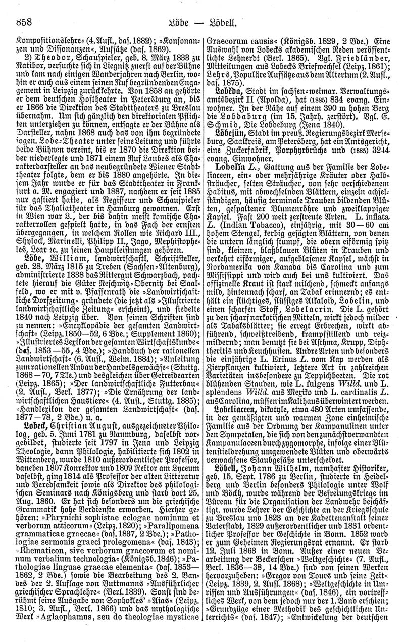 Lobeck, Christian August, ausgezeichneter Philolog, geb. 5. Juni 1781 zu Naumburg, daselbst vorgebildet, studierte seit 1797 in Jena und Leipzig Theologie, dann Philologie, habilitierte sich 1802 in Wittenberg, wurde 1810 außerordentlicher Professor, daneben 1807 Konrektor und 1809 Rektor am Lyceum daselbst, ging 1814 als Professor der alten Litteratur und Beredsamkeit sowie als Direktor des philologischen Seminars nach Königsberg und starb dort 25. Aug. 1860. Er hat sich besonders um die griechische Grammatik hohe Verdienste erworben. Hierher gehören: "Phrynichi sophistae eclogae nominum et verborum atticorum" (Leipz. 1820); "Paralipomena grammaticae graecae" (das. 1837, 2 Bde.); "Pathologiae sermonis graeci prolegomena" (das. 1843); "Rhematicon, sive verborum graecorum et nominum verbalium technologia" (Königsb. 1846); "Pathologiae linguae graecae elementa" (das. 1853-1862, 2 Bde.) sowie die Bearbeitung des 2. Bandes der 2. Auflage von Buttmanns "Ausführlicher griechischer Sprachlehre" (Berl. 1839). Sonst sind berühmt seine Ausgabe von Sophokles' "Aias" (Leipz. 1810; 3. Aufl., Berl. 1866) und das mythologische Werk "Aglaophamus, seu de theologiae mysticae Graecorum causis" (Königsb. 1829, 2 Bde.) Eine Auswahl von Lobecks akademischen Reden veröffentlichte Lehnerdt (Berl. 1865). Vgl. Friedländer, Mitteilungen aus Lobecks Briefwechsel (Leipz. 1861); Lehrs, Populäre Aufsätze aus dem Altertum (2. Aufl., das. 1875).