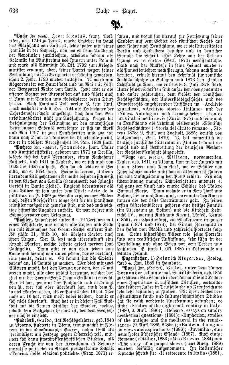 he (sftr. paich), Jean Rico las, franz. Politiker, geb. 1746 zu Paris, wurde Erzieher im .haus des Marschalls von Castries, lebte später mit seiner Familie in der Schweiz, von wo er beim Ausbruch oer Revolution zurückkehrte, arbeitete sodann als Volontär im Ministerium des Innern unter Roland und ward als Girondist 18. Okt. 1792 zum Kriegsminister ernannt, aber, seiner Partei wegen seiner Verbindung mit der Bergpartei verdächtig geworden, schon 2. Febr. 1793 wieder entlassen. P. ward nun Abgeordneter der Hauptstadt und im Mai mit Hilfe der Bergpartei Maire von Paris. Jetzt trat er als offener Gegner der Girondisten auf und führte auch -^. Juni mit Danton und Robespierre deren Sturz herbei. Nach Dantons Fall verlor P. fein Amt, ward verhaftet und 9. Dez. 1794 als Teilnehmer der Schreckensherrschaft angeklagt; doch kam das Verurteilungsdekret nicht zur Ausführung. Gegen die Beschuldigung der Teilnahme an den anarchischen Bestrebungen Babeufs verteidigte er sich im April und Mai 1797 in zwei Denkschriften und zog sich dann nach Thym le Moutiers bei Charleville zurück, wo er in völliger Vergessenheit 18. Nov. 1823 starb.