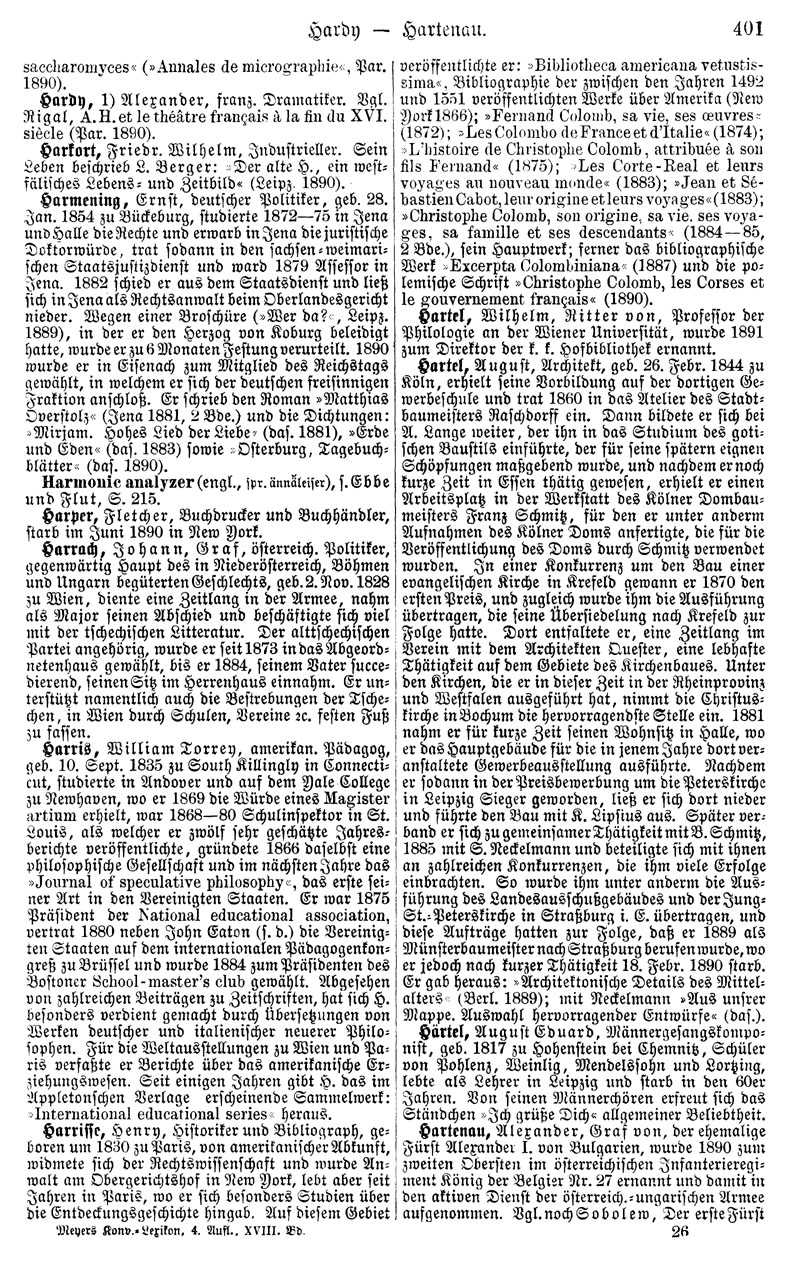 Harrisse, Henry, Historiker und Bibliograph, geboren um 1830 zu Paris, von amerikanischer Abkunft, widmete sich der Rechtswissenschaft und wurde Anwalt am Obergerichtshof in New York, lebt aber seit Jahren in Paris, wo er sich besonders Studien über die Entdeckungsgeschichte hingab. Auf diesem Gebiet veröffentlichte er: »Bibliotheca americana vetustissima«, Bibliographie der zwischen den Jahren 1492 und 1551 veröffentlichten Werke über Amerika (New York 1866); »Fernand Colomb, sa vie, ses œuvres« (1872); »Les Colombo de France et d'Italie« (1874); »L'histoire de Christophe Colomb, attribuée à son fils Fernand« (1875); »Les Corte-Real et leurs voyages au nouveau monde« (1883); »Jean et Sébastien Cabot, leur origine et leurs voyages« (1883); »Christophe Colomb, son origine, sa vie, ses voyages, sa famille et ses descendants« (1884-85, 2 Bde.), sein Hauptwerk; ferner das bibliographische Werk »Excerpta Colombiniana« (1887) und die polemische Schrift »Christophe Colomb, les Corses et le gouvernement français« (1890).