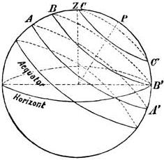 nebenstehenden Figur bezeichnet Z den Zenith, P den Nordpol, A A', B B', C C' Parallelkreise, welche im Laufe eines Tages von Fixsternen beschrieben werden.