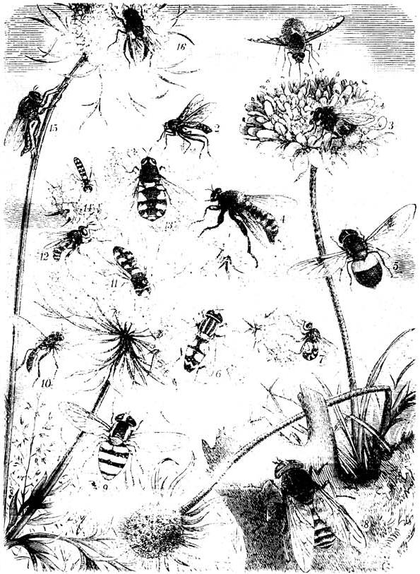 Raubfliegen (s. d.; hierzu gehören: die gelbe Mordfliege, Laphria flava L., Fig. 4; die Habichtsfliege, Dioctria linearis Fab., Fig. 10; die gestielte Raubfliege, Asilus stylifer Loew, Fig. 15), Tanzfliegen (s. d.; hierher die gewürfelte Tanzfliege, Empis tessellata Fab., Fig. 2), Hummelfliegen (s. d., mit dem großen Wollschweber, Bombylius major L., Fig. 1) Schwebfliegen (s. d.; zu ihnen gehören: die gefleckte Federfliege; Volucella plumata Meigen, Fig. 3; die durchscheinende Federfliege, Volucella pellucens L., Fig. 5; der Sonnenschweber, Helophilus pendulus L., Fig. 6; die gelbbindige Federfliege Volucella inanis L., Fig. 9; die Birnschwebfliege, Syrphus pyrastri L., Fig. 11, und Melithreptus dispar Loew, Fig. 14), Biesfliegen (s. d.), Gemeinfliegen (mit der Taschenmesserfliege, Myopa testacea L., Fig. 7; der gelbfüßigen Dickkopffliege, Canopus flavipes L., Fig. 12, und der Mittagsfliege, Mesembrina meridiana L., Fig. 16) und Buckelfliegen (s. d.).