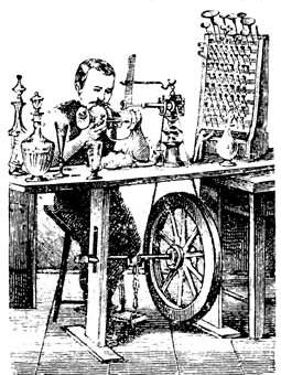 Das Schleifen des Hohlglases geschieht entweder auf Schleifbänken mit horizontaler Scheibe (Arbeit des Schleifers), um Bodenflächen,
