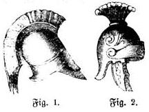 Im griechischen Altertum trug man zunächst H. aus Fell, namentlich Seehundsfell, dann aus Bronze. Die ehernen H. hatten anfangs die einfache Haubenform, später waren sie mit Stirnschirm nebst Nasenstück, mit Nackenschirm und Backenstücken, oft auch mit unbeweglichen Visieren, in denen sich Öffnungen zum Durchsehen befanden, versehen. Der zugleich zum erhöhten Schutze des Schädels und Hinterkopfs mit einem Kamm versehene H., der seinerseits wieder einen Helmbusch, gewöhnlich aus Roßhaaren trägt, ist der eigentliche Typus eines griechischen H. (s. Fig. 1).