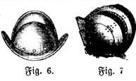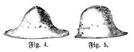 Im 13. Jahrh, kam gleichzeitig mit dem Topfhelm (Kübelhelm oder Stülphelm, s. Fig.3) die Kesselhaube (Beckenhaube, Bassinet) auf. Die Topfhelme waren oben flach und folgten meistens der Wölbung des Gesichts. Bald mit schmalen, bald mit ziemlich weiten Augenschlitzen, meistens mit darunter befindlichen Luftlöchern versehen, wurden diese schweren, einem eisernen Topfe ähnelnden H. über den Kopf gestülpt, aus dem sie eigentlich nur hingen. Ende des 13. und Anfang des 14. Jahrh, ging dieser H. in eine Form über, die mehr auf den Schultern ruhte und mehr walzenförmig, oben rund oder stachkegelförmig geschlossen war. Während des ganzen 14. Jahrh, diente er namentlich als Kopfbedeckung im ritterlichen Lanzenkampf. Während die Ritter anfangs den Topfhelm über eine an der Brünne (s. d.) befestigte, den ganzen Kopf außer dem Gesicht bedeckende Haube aus Kettengeflecht (Helmbrünne), wahrscheinlich jedoch erst im Augenblick des Kampfes, stülpten, trugen sie seit dem 13. Jahrh, unter dem Topfhelm, öfters aber auch ohne diesen, die Kesselhaube oder Beckenhaube, die dadurch entstand, daß der Oberteil jener Kapuze aus Kettengeflecht ausgeschnitten und in dieselbe eine anfangs der Schädelform angepaßte, später konisch mehr erhöhte und spitz geformte Haube aus glattem Blech eingesetzt wurde, um so das Drücken des Kettengeflechts auf den Schädel zu verhindern. Gleichzeitig mit der Kesselhaube entwickelte sich als eine besondere Kopfbedeckung für sich der mit einem Rand versehene, von Fußgängern im Kriege viel getragene Eisenhut (s. Fig. 4), der mittels eines ledernen, im Innern an angenieteten Plättchen befestigten Sturmbandes aus dem Kopfe festgebunden werden mußte.