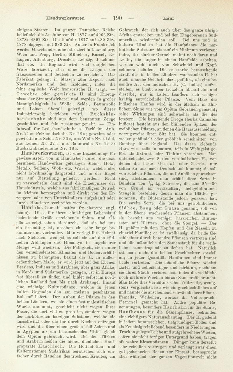 Hanf (lat. Cannabis sativa, frz. chanvre, engl. hemp). Diese für ihren einjährigen Lebenslauf bedeutende Größe erreichende Spinn- und Ölpflanze zeigt schon hierdurch, daß sie bei uns ein Fremdling ist, obschon ein sehr lange bekannter und vertrauter. Man verlegt ihre Heimat nach Südasien, wenigstens soll sie auf den südlichen Abhängen des Himalaya in ungeheurer Menge wild wachsen. Die Fähigkeit, sich unter den verschiedensten Klimaten und Bodenverhältnissen zu behaupten, besitzt der H. in außerordentlichem Maße; er wird jetzt auf den Ebenen Persiens, Indiens und Arabiens, über ganz Afrika, in Nord- und Südamerika gezogen, ist in Europa fast überall zu finden und bildet selbst im nördlichen Rußland fast bis nach Archangel hinauf eine wichtige Kulturpflanze, welche in jenen kalten Gegenden den am meisten geschätzten Rohstoff liefert. Der Anbau der Pflanze in den heißen Ländern, wo sie einen fast majestätischen Wuchs annimmt, geschieht nicht wegen ihrer Faser, die dort viel zu grob ist, sondern wegen der narkotischen harzigen Substanz, welche sie ausschwitzt oder die ihr durch Kochen entzogen wird und die über einen großen Teil Asiens und in Ägypten als ein berauschendes Mittel gleich dem Opium gebraucht wird. Bei den Türken und Arabern heißen die hierzu dienlichen Hanfpräparate Haschisch. Die Hottentotten- und Kaffernstämme Südafrikas berauschen sich einfacher durch Rauchen des trocknen Krautes, ein Gebrauch, der sich auch über das ganze übrige Afrika erstrecken und bei den Eingeborenen Südamerikas wiederfinden soll. Bei uns und in kältern Ländern hat die Hanfpflanze die narkotische Substanz bis auf ein Minimum verloren; indes, ihr starker Geruch mahnt noch daran und Leute, die länger in einem Hanffelde arbeiten, werden wohl auch von Schwindel und Kopfschmerz befallen. Die so starke berauschende Kraft des in heißen Ländern wachsenden H. hat auch manche Gelehrte dazu geführt, als eine besondre Art den indischen H. (C. indica) aufzustellen; es bleibt aber trotzdem überall eine und dieselbe, nur in kalten Ländern sich weniger kräftig entwickelnde Pflanze. Vom Harz des indischen Hanfes wird in der Medizin in ähnlichem Sinne wie vom Opium Gebrauch gemacht; seine Wirkungen sind schwächer als die des letztern. Die betreffende Droge (herba Cannabis indicae) besteht aus den blühenden Spitzen der weiblichen Pflanze, an denen die Harzausscheidung vorzugsweise ihren Sitz hat. Sie kommen entweder gebündelt oder gröblich zerschnitten von Bombay über England. Das daran klebende Harz wird teils in natura, teils in Weingeist gelöst als Extrakt oder Tinktur verordnet. Man unterscheidet zwei Sorten von indischem H., von denen die beste, Gunjah oder Ganja, nur selten zu uns nach Deutschland kommt; sie soll von solchen Pflanzen, die auf Anhöhen gewachsen sind, abstammen; man erhält diese Sorte in Bündeln von ½ kg Schwere, die aus 25-30 von Grund an verästelten, hellgelbbraunen Stengeln bestehen, denen man die Blätter genommen, die Blütenstände jedoch gelassen hat. Die zweite Sorte, die bei uns gewöhnlichere, Sidhee, Bang oder Guaza genannt, soll von in der Ebene wachsenden Pflanzen abstammen; sie besteht aus weniger harzreichen Blütenästen mit Blättern, ohne die Stengel. -