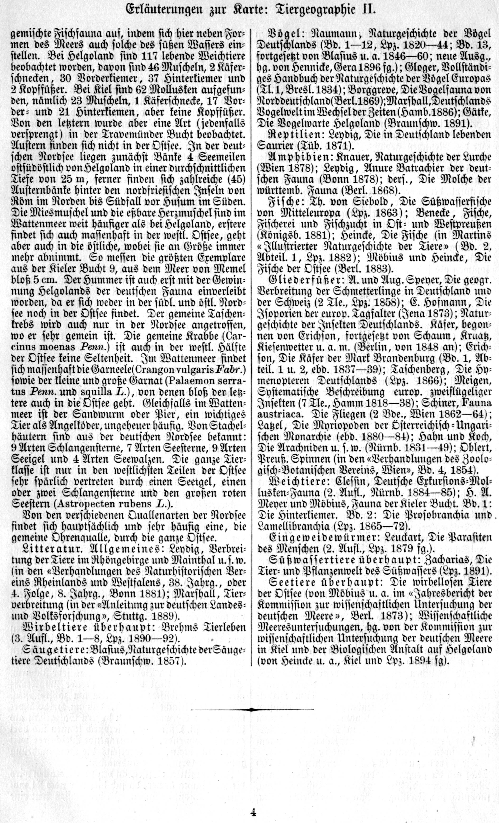 Fische: Th. von Siebold, Die Süßwasserfische von Mitteleuropa (Lpz. 1863); Benecke, Fische, Fischerei und Fischzucht in Ost- und Westpreußen (Königsb. 1881); Heincke, die Fische (in Martins "Illustrierter Naturgeschichte der Tiere" (Bd. 2, Abteil. 1, Lpz. 1882); Möbius und Heincke, Die Fische der Ostsee (Berl. 1883).
